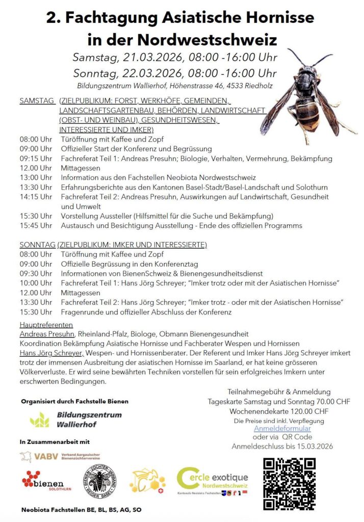 Das Programm ist gut gefüllt mit Fachvorträgen, es treffen sich bekannte Gesichter. In der Ausstellung steht unseren Velutina Army Stand mit fachkundiger Begleitung bereit zum Gespräch: Informationen zum Tier, zur Bekämpfung, zum Schweizer Hornissenportal ( Monitoren, Scannen, Finden, Prognosen, Nesterentwicklung in der Fläche und Verbreitung). Unsere Schweizer Kolleg/innen sind interessiert, wie es in Deutschland läuft, denn wir grenzen aneinander, und wir in Deutschland tragen damit Verantwortung.