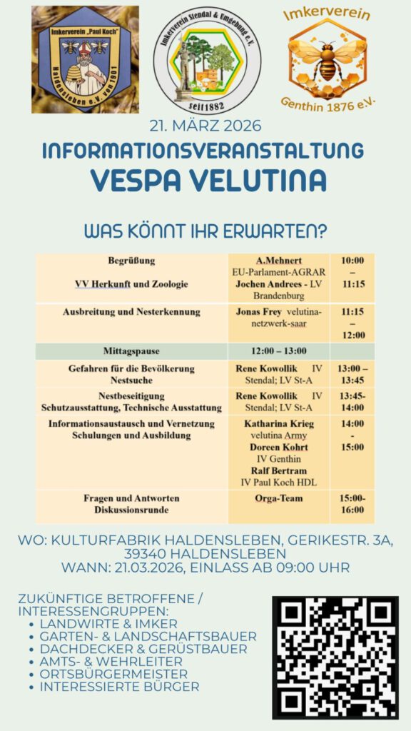 Eine weitere Vertreter/in der Velutina Army Readaktion ist unterwegs in der Kulturfabrik in Haldersleben in Sachsen-Anhalt zur Informationsveranstaltung Vespa Velutina. Hier steht die Information für zukünftig Betroffene im Vordergrund: das sind Handwerker wie z.B. Dachdecker, Landwirtschaft, Obstanbau, Imker, alle die draußen arbeiten müssen und auf Tiere treffen werden und für die interessierte Bevölkerung. Wer und was ist Vespa velutina nigrithorax – und betrifft es MICH – wenn ja: warum und was kann ich tun?